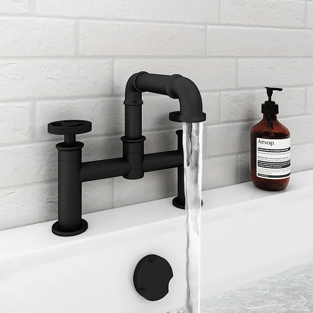 The stylish Arezzo industrial-style matt black bath filler tap is perfect for adding a striking finishing touch to your contemporary bathroom. Crafted to the highest standards, this stunning deck mounted tap features a stripped-down aesthetic with round knurled textured tap heads, perfect for creating an eye catching industrial look in your bathroom. Plated in a matt black finish which is highly resistant to corrosion.