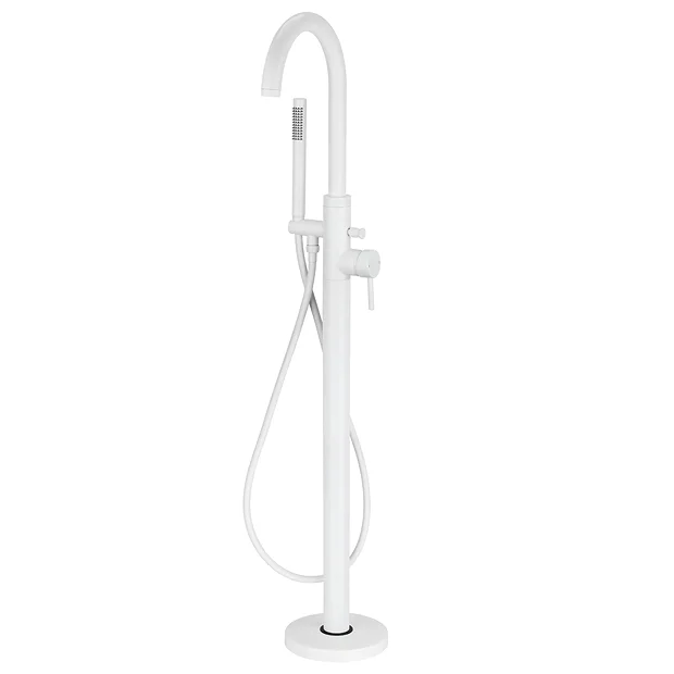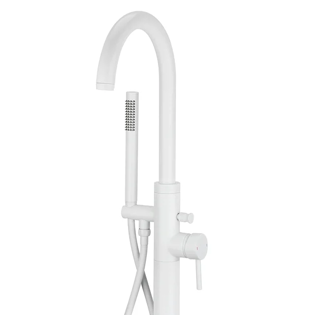 This eye catching matt white Arezzo Freestanding Bath Tap with Shower Mixer is an ideal choice to bring a touch of designer chic to your bathroom. Tap features a curved, round spout and also comes with a matching single-lever tap head provides efficient control of both temperature and flow. Crafted from solid brass, this matt white deck mounted bath tap has a high-quality build and has been designed for use with freestanding baths. Perfect for creating a clean minimalist look. Supplied with round handheld shower handset that’s easy to manoeuvre thanks to its matching white flexible 1500mm hose.