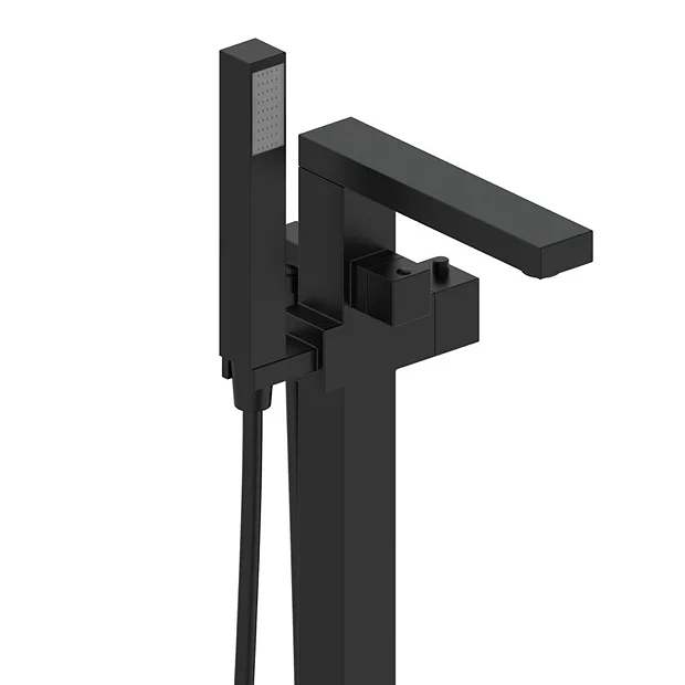 Create an eye-catching statement in your bathroom with the luxury Arezzo matt black square thermostatic freestanding bath shower mixer tap. It features a modern elegant geometric design and is complemented by a single square tap head that gives fingertip control of the temperature and flow of water. The tap has been manufactured from solid brass with a stylish matt black finish and is suitable for system pressures of 1.0 Bar or greater. The tap is supplied with a shower kit consisting of a handheld rectangular shower handset and flexible hose.