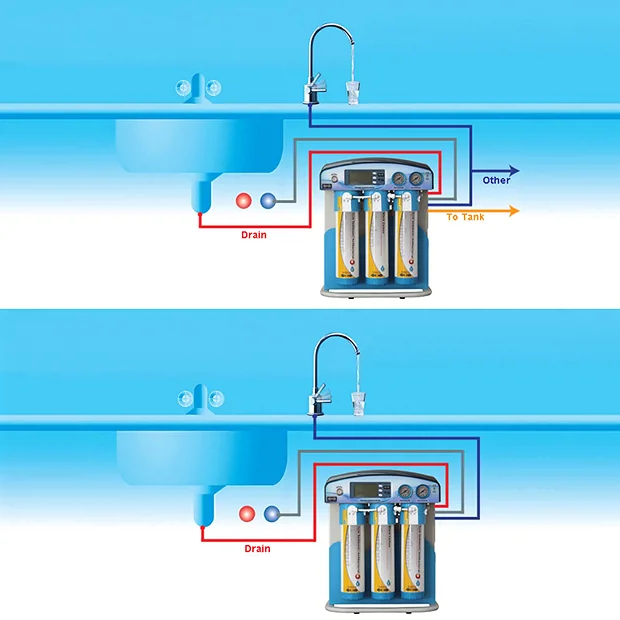 With the push of a button or by looking at the bar graph on the display, the user will know exactly how many days are left until the next filter change. The system will also create a sound alarm when it is time to change the filters and even cut the water flow if it is surpassed significantly.