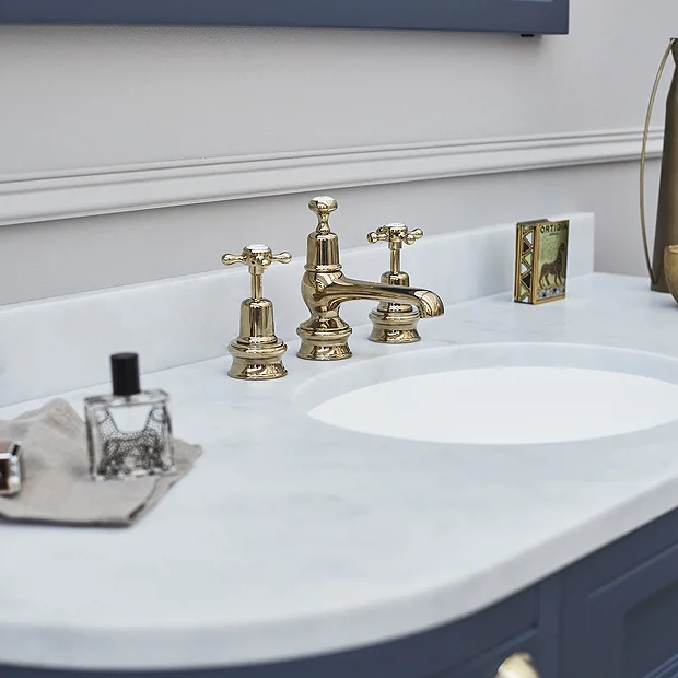 This Burlington Claremont Regent 3 tap hole basin mixer in a stunning Gold finish adds a sense of opulence and grandeur to your bathroom. The Regent base gives the tap a ridged, slightly taller, elegant appearance. The tap features quarter turn valves and comes supplied with a pop-up waste. All Burlington taps come supplied with two Neoperl devices: A flow straightener, which is for use with low water pressures and an aerator, which is for use with high water pressures.