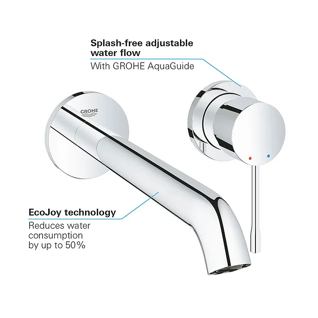 The Essence wall mounted 2-hole basin mixer has an elegant, subtle design that will be a real highlight in your bathroom. This L-Size version features a 230mm spout for maximum comfort in your daily bathroom routines. The tap features an easy to use metal lever and GROHE EcoJoy which reduces water consumption by up to 50% without compromising on performance. The spray angle of the spout can be adjusted precisely with the integrated GROHE AquaGuide.