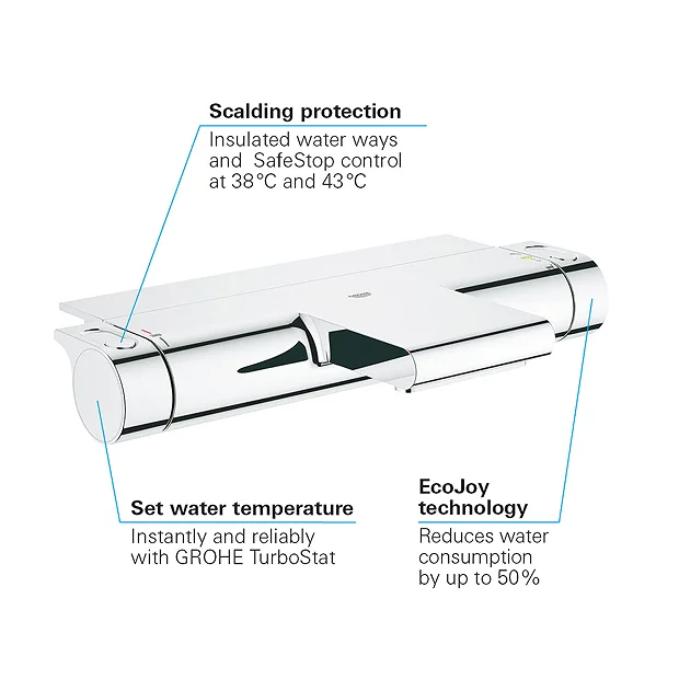 This Grohtherm 2000 Thermostatic Bath Shower Mixer delivers perfect water temperature control for your bath and shower. It’s extra-wide spout creates a silent waterfall effect while the integrated EasyReach tray keeps shower products to hand. It benefits from GROHE TurboStat® technology, your water temperature stays constant, regardless of any fluctuations in your water supply or water pressure. The GROHE Aqua Paddles are easy to use, even with soapy hands while the SafeStop button protects you and your children from scalding. The first limit is preset at 38°C. If desired, temperatures of up to 43°C can be selected upon deactivating the SafeStop button. With GROHE EcoJoy® technology, you can indulge in a perfectly comfortable shower or bath while reducing water consumption.