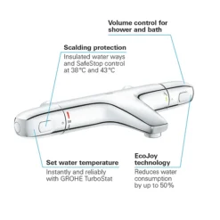 This Grohtherm 1000 Thermostatic Bath Shower Mixer is safe and ergonomic and great value for money. It benefits from GROHE TurboStat® technology, your water temperature stays constant, regardless of any fluctuations in your water supply or water pressure. The easy to grip controls can always be adjusted effortlessly, even with soapy hands while the integrated SafeStop system preventing users from turning up the temperature too high. The first limit is preset at 38°C. If desired, temperatures of up to 50°C can be selected upon deactivating the SafeStop button. With GROHE EcoJoy® technology, you can indulge in a perfectly comfortable shower or bath while reducing water consumption.