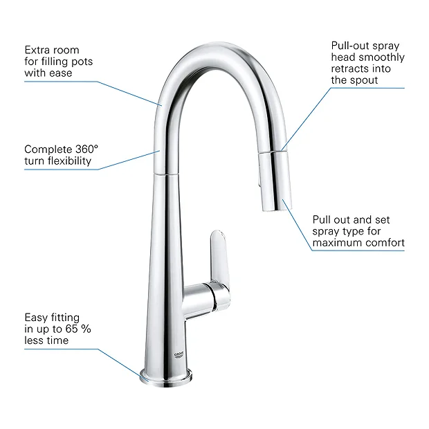 Bring design flair and operating power to your kitchen with the Grohe Veletto kitchen sink mixer with a 2-spray pull-out comfort shower head. The high C-shaped spout leaves plenty of room for filling large pots or vases, and the spout swivels smoothly through 360° for added flexibility. The pull-out comfort shower head is perfect for rinsing the sink or prepping vegetables and offers 2 different spray types – a laminar spray and a powerful jet spray. GROHE EasyDock ensures that the shower head is drawn easily back into place. Installation is tool and hassle free thanks to the GROHE QuickFix Plus installation system.