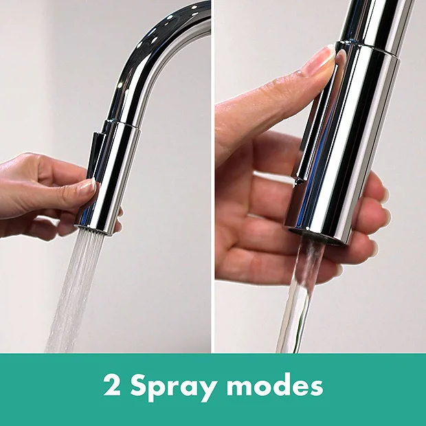 The elegant hansgrohe Cento XL Single Lever Kitchen Mixer tap has a handy 411mm height that fits awkward-shaped pots, and features a swivelling spout with a practical pull out spray head. Use the button to switch between normal spray and a shower spray that allows you to rinse without splashing. This hansgrohe kitchen tap helps reduce flow rate without compromising on performance, saving you energy. Thanks to QuickClean technology, the nozzle can be quickly rid of limescale.