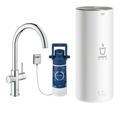 - Hot tap turns clockwise to open / Cold tap turns anti-clockwise to open