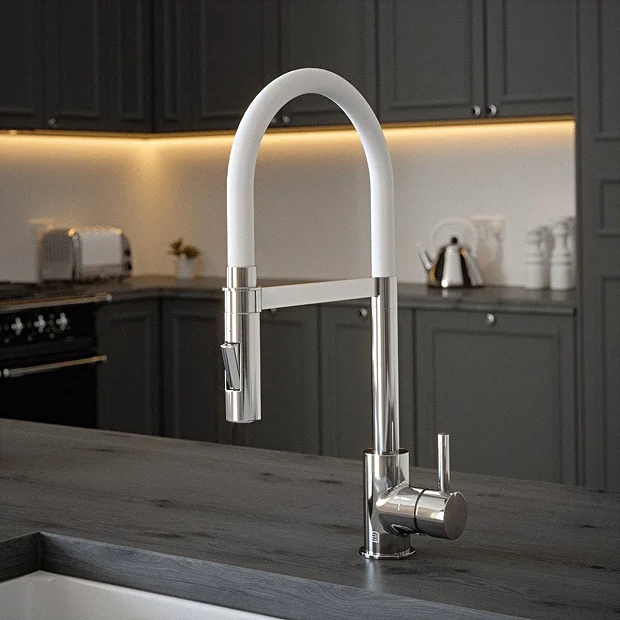 Enhance your kitchen design with the vibrantly coloured Vibrance Tube kitchen mixer tap. This colourful kitchen tap will make your life easier when rinsing dishes thanks to the pull out spray function. Manufactured from durable brass with a chrome finish body, there are 11 tube colour options to choose from allowing you to pair the kitchen tap with accessories and appliances alike.