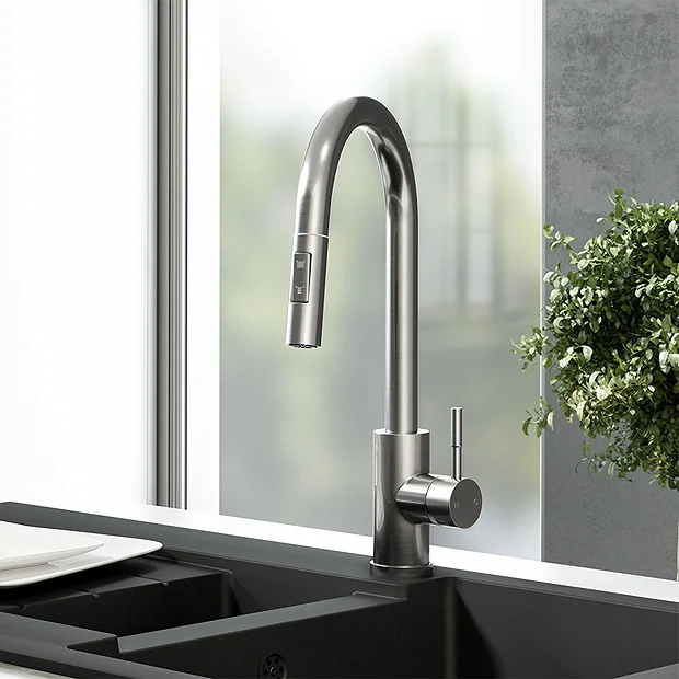 This contemporary Venice dual function kitchen mixer tap will refresh your kitchen. The tap features a 360-degree swivel spout and a convenient pull-out spray head. By pressing the button, you can switch between normal and shower sprays.
